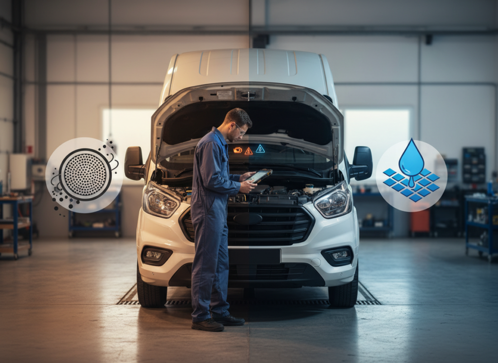 Mobile technician working on a Ford Transit EcoBlue to resolve no-start countdown issue